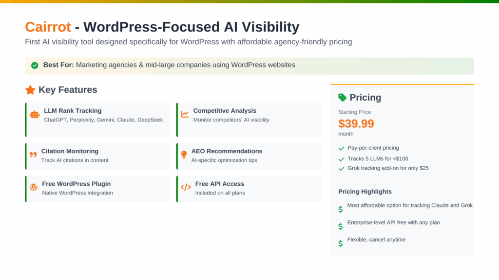 Cairrot is positioned as the affordable entry point into AEO tracking, specifically for the massive WordPress ecosystem. Its key differentiators include its affordability (lowest cost option for Grok and Claude tracking, significantly lower entry price compared to most competitors on this list), WordPress specific features, and an advanced API available for free with every plan.