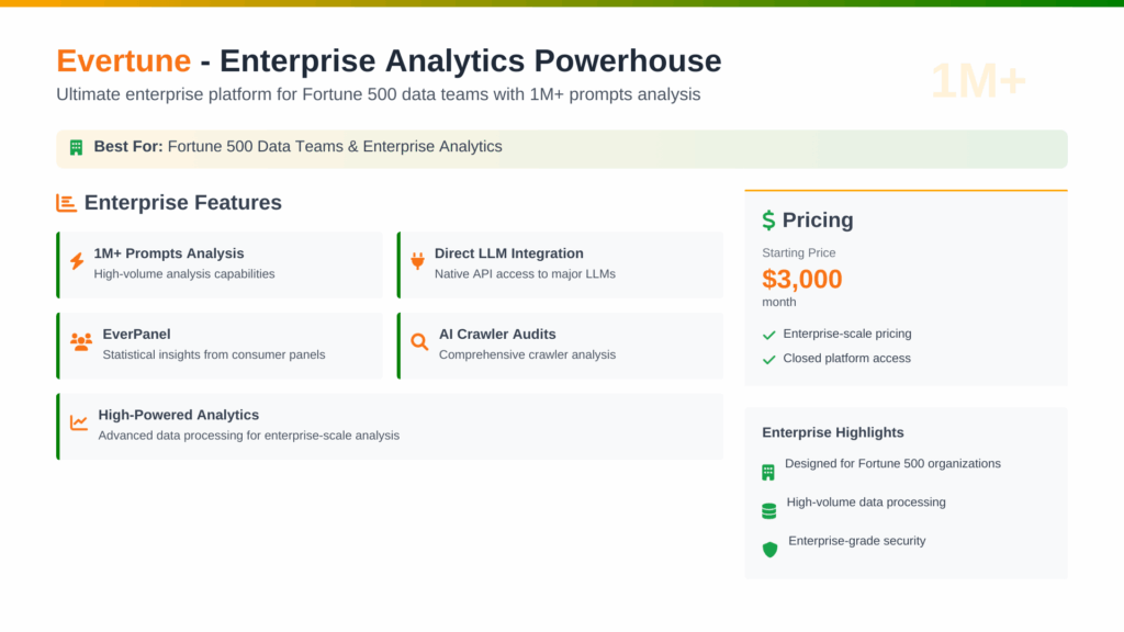 Evertune is a premium, enterprise-only platform designed for Fortune 500 brands where AI is a primary marketing channel. Its key differentiator is its methodology, which combines direct API integration with base LLMs and a proprietary consumer panel (“EverPanel”) to deliver statistically accurate visibility measurement.