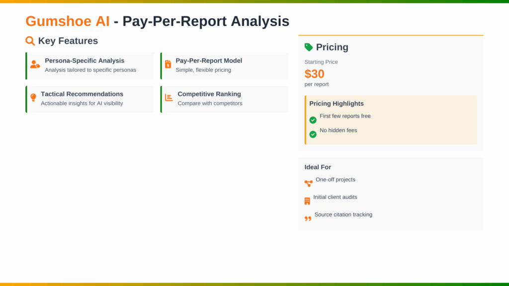 Gumshoe AI takes a completely different approach. Instead of a monthly subscription, you pay per report. This is perfect for one-off projects, initial client audits, or teams that don’t need continuous monitoring.