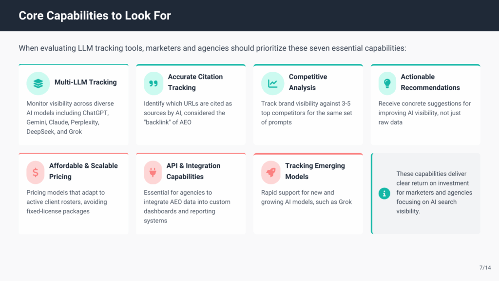 When evaluating LLM tracking tools, most digital marketers and agencies are looking for a specific set of features and outcomes that deliver clear ROI. Here’s what matters most: