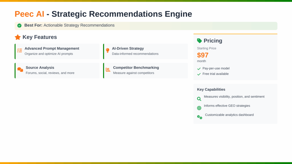 Peec AI is a strong, affordable option that competes well with Cairrot on price. Its ability to pull in source analysis from beyond just websites (like forums and social media) is a unique strength. For teams that need a bit more hand-holding on strategy, Peec AI is an excellent choice.