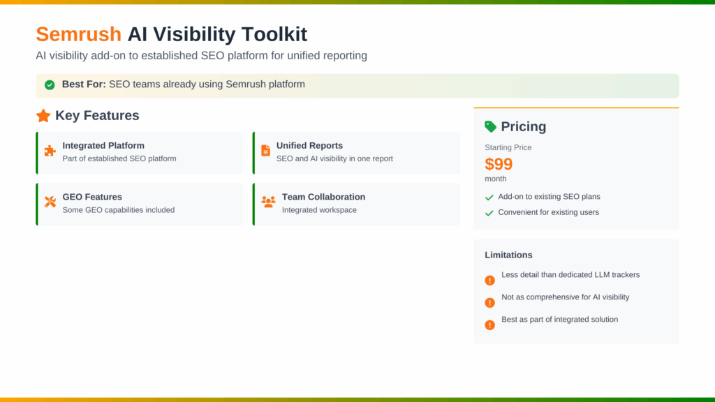 Semrush’s AI Visibility Toolkit is an add-on designed as an extension of their established SEO platform, allowing users to dip into AEO without switching tools. It’s a convenient choice for teams already invested in Semrush, providing basic insights into AI-generated answers. However, it lacks the depth and precision of dedicated LLM trackers, making it feel more like a bolt-on feature than a standalone solution.