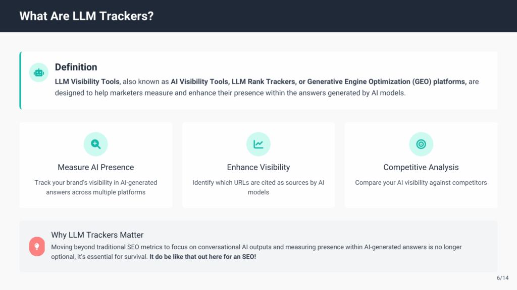 LLM Rank Trackers, also known as AI Visibility, LLM Monitoring, or Generative Engine Optimization (GEO) tools, are a new class of software designed to help marketers measure and improve their presence in the answers generated by AI models. Unlike traditional SEO rank trackers that monitor a URL’s position for a keyword on a SERP, these tools analyze the output of conversational AI.