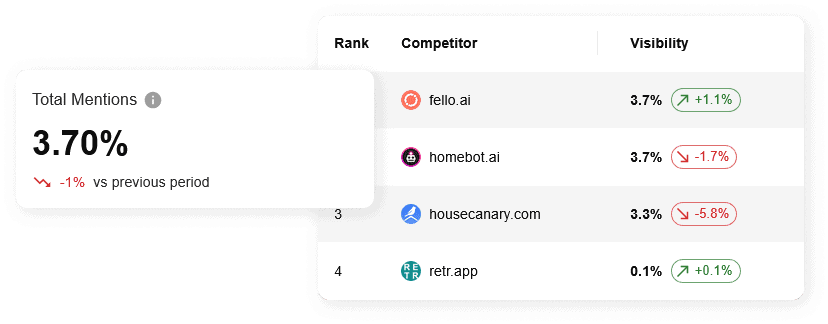 This is your competitive intelligence hub. Track how your rivals are performing for your target prompts, see who is gaining or losing ground, and uncover the strategies that are winning in the AI space.