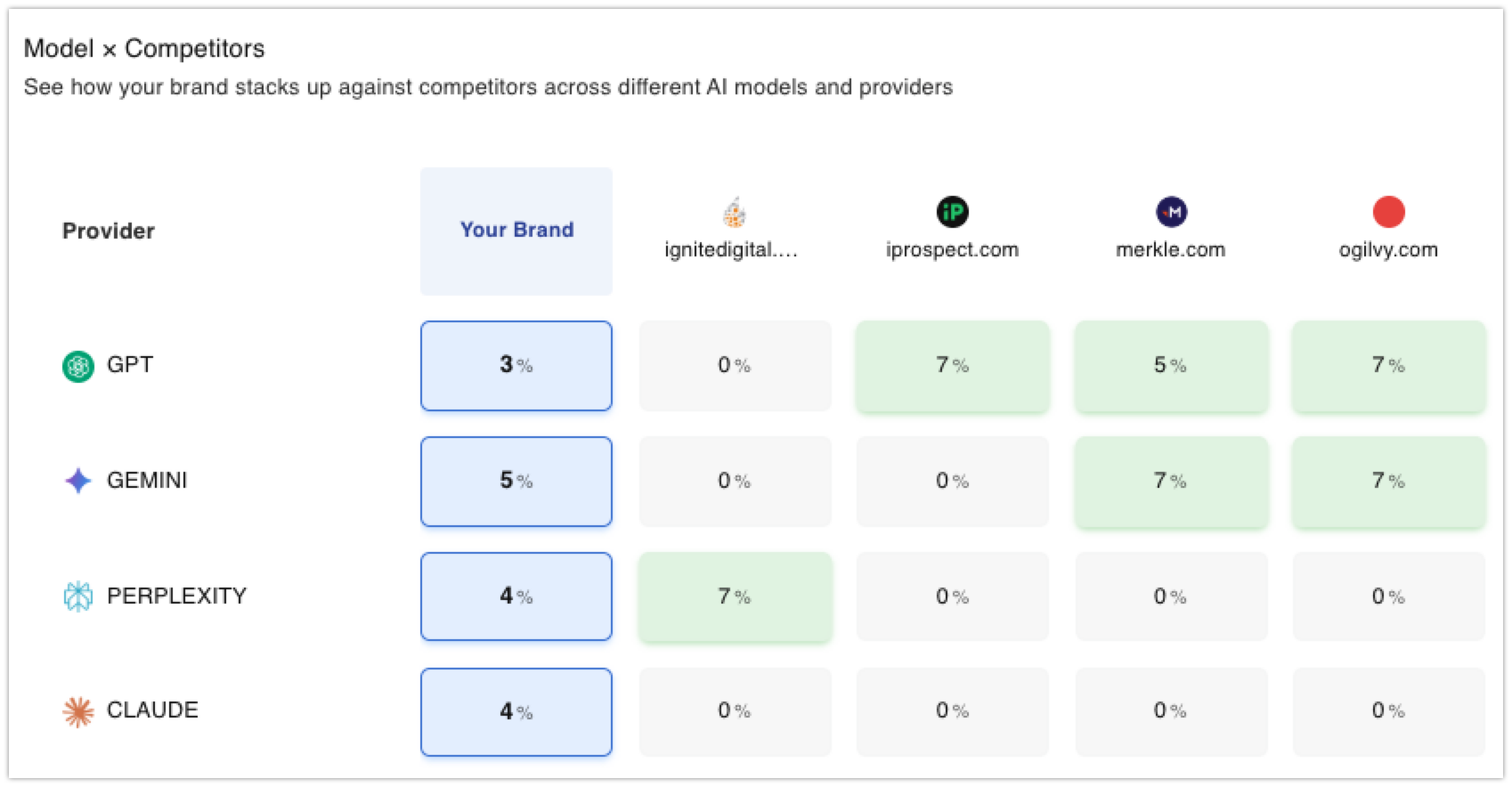 See exactly where you stand. The Leaderboard ranks you, your competitors, and other domains for visibility across your tracked prompts. Instantly identify the top players and measure your market share in AI answers.