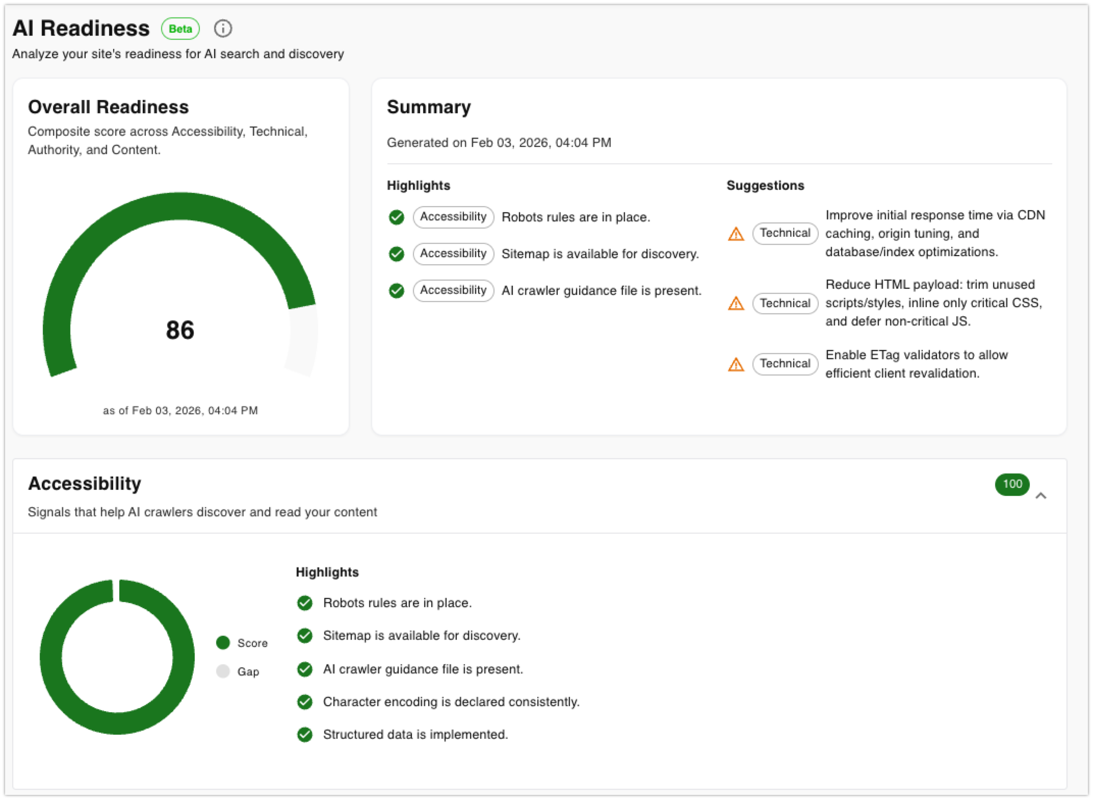 From the AI Readiness report, you’ll receive dozens of optimization priorities for the website(s) you entered.