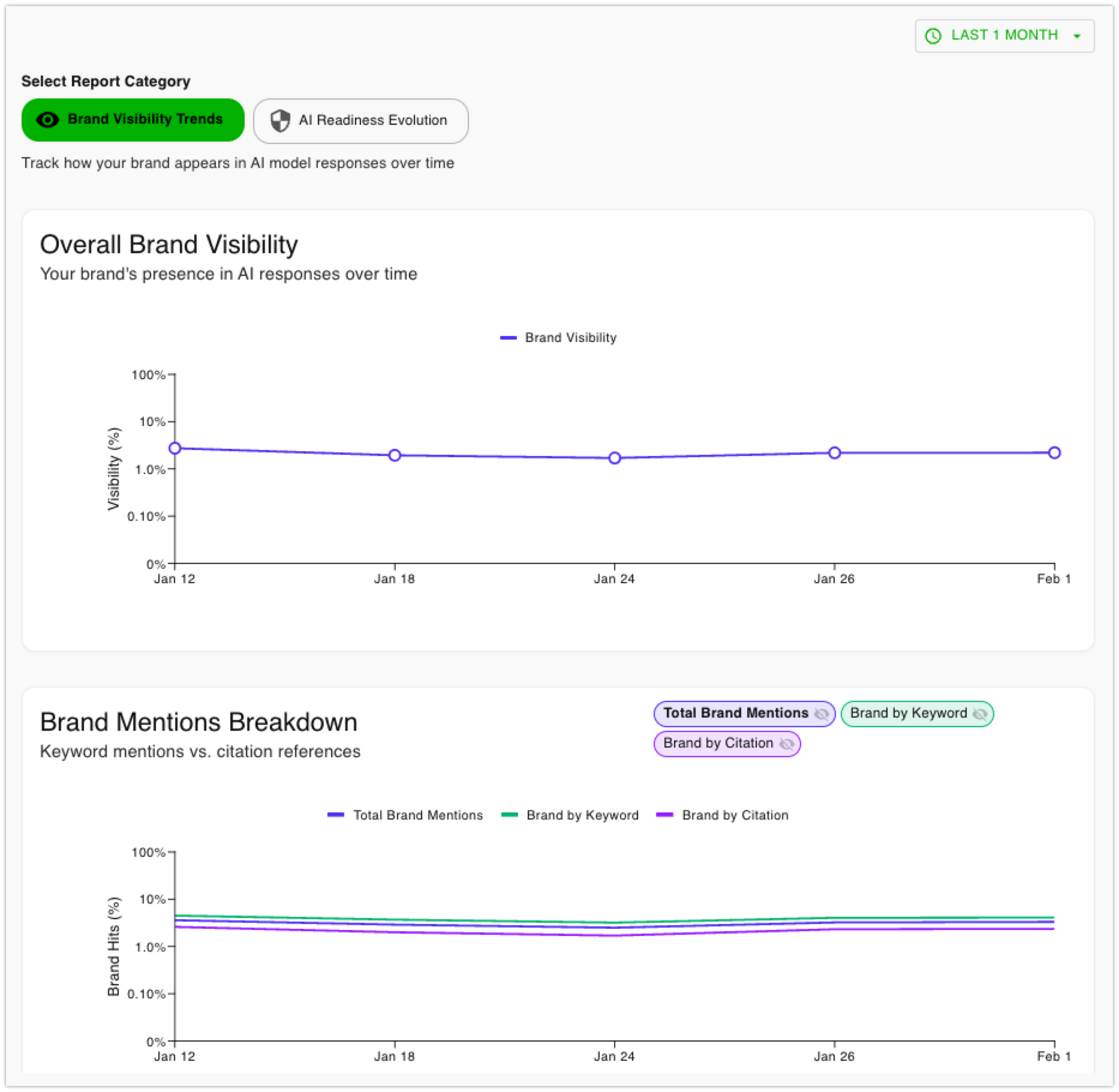Visualize your progress over time. Our trend graphs show your AI visibility, citation frequency, and keyword performance, allowing you to connect your optimization efforts directly to measurable results and growth.