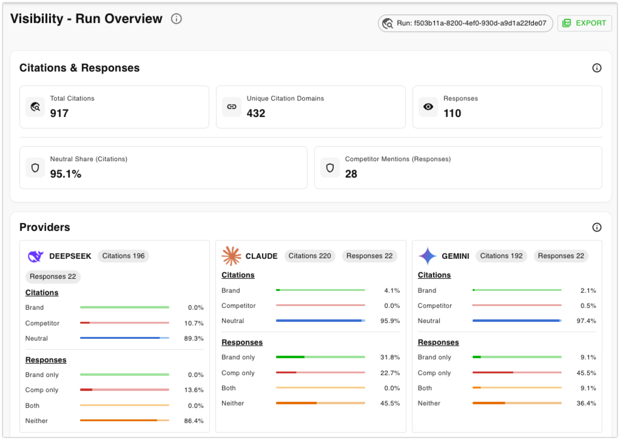 Generate professional, shareable reports with a single click. These comprehensive summaries are perfect for stakeholder meetings, client updates, and internal reviews, making it easy to communicate your AEO success and strategy.