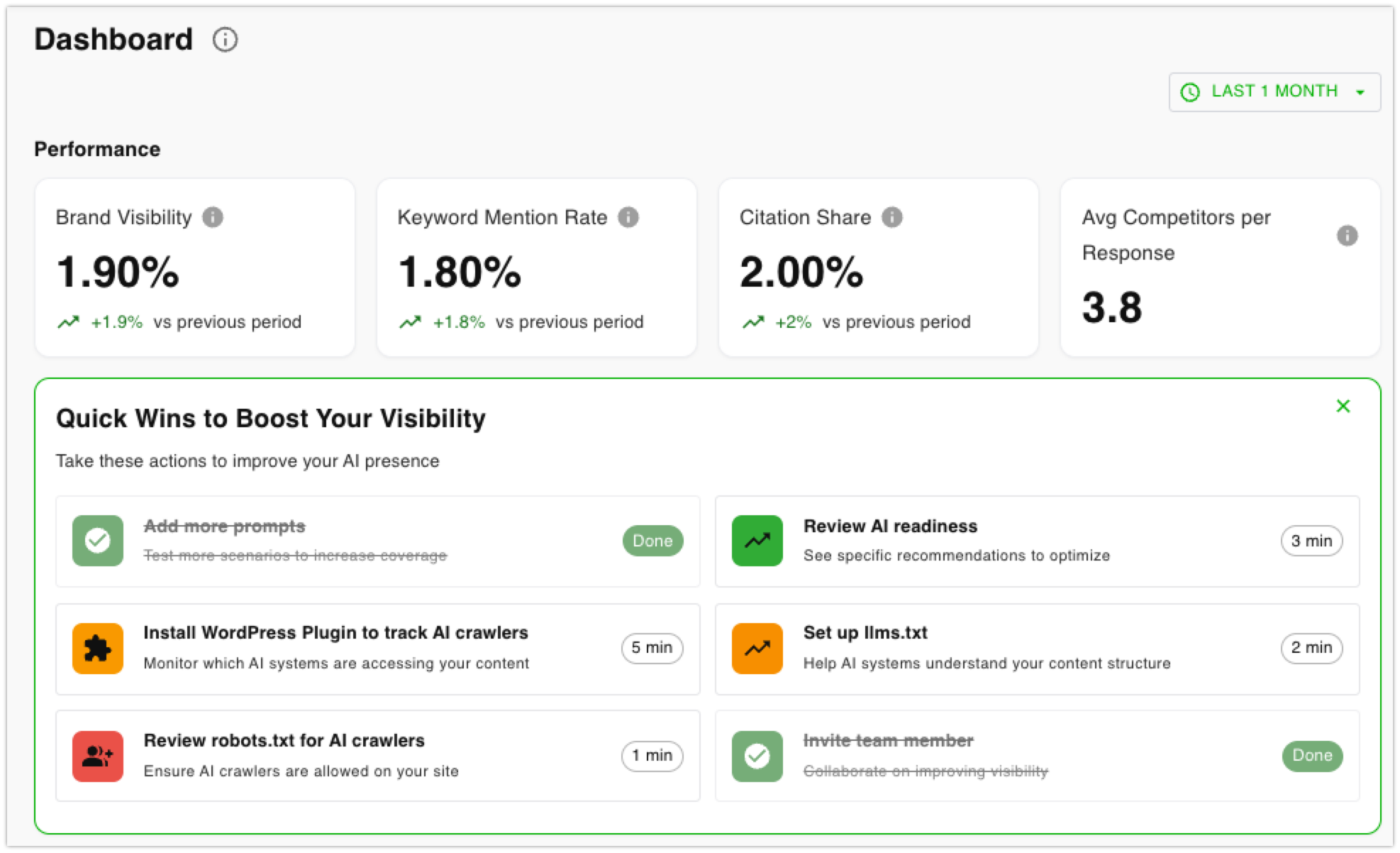 Your at-a-glance overview of AI performance. The main dashboard highlights your most important metrics, visibility trends, and competitive positioning, so you can instantly gauge your status and spot critical changes.