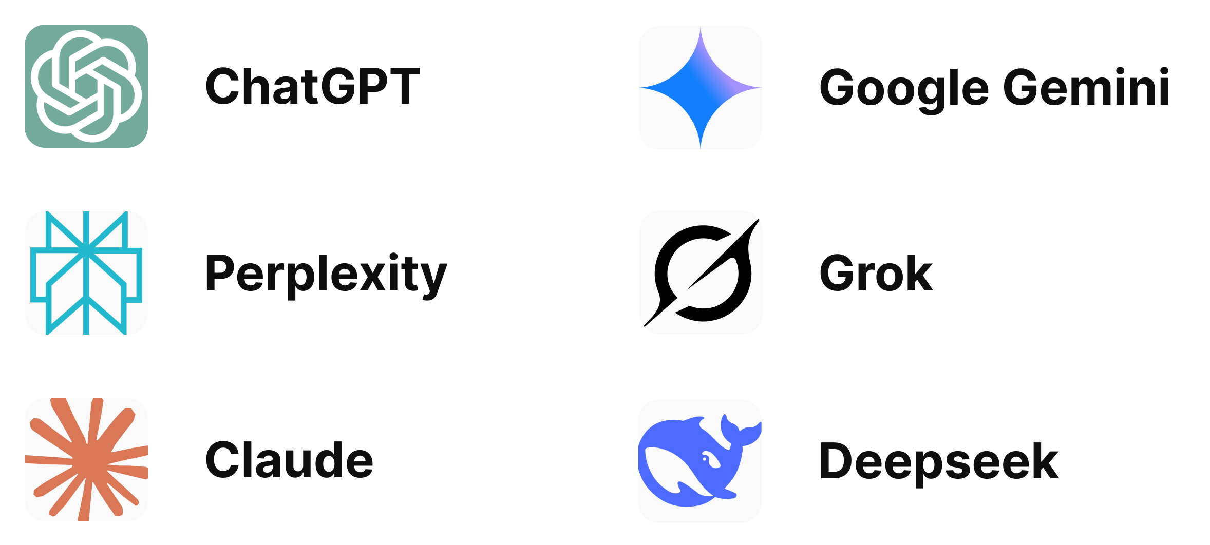 - Monitor 5 LLMs (ChatGPT, Perplexity, Gemini, Claude, and DeepSeek)