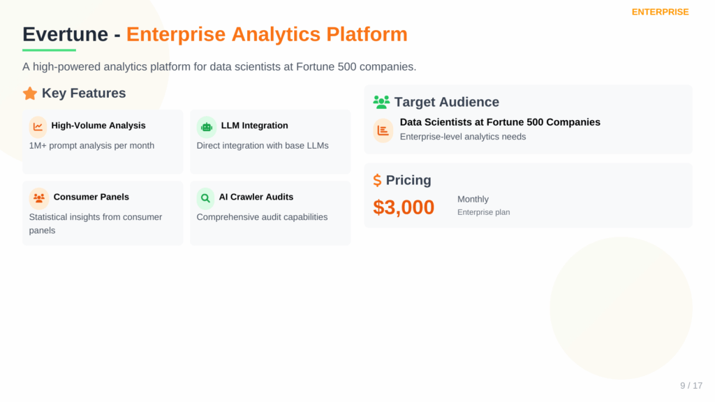 If you’re a data scientist at a Fortune 500 company tasked with understanding AI visibility, Evertune is built for you. With a starting price of $3,000/month, it’s in a different league entirely.