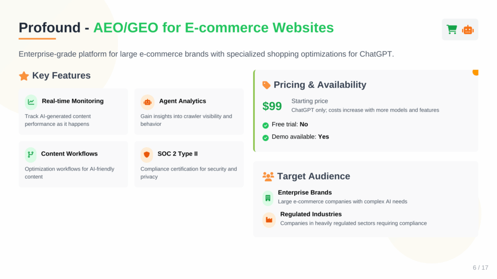 Profound positions itself as an enterprise-grade platform, and it has the feature set and price tag to match. It’s particularly strong for large e-commerce brands due to its specialized shopping optimizations for ChatGPT.